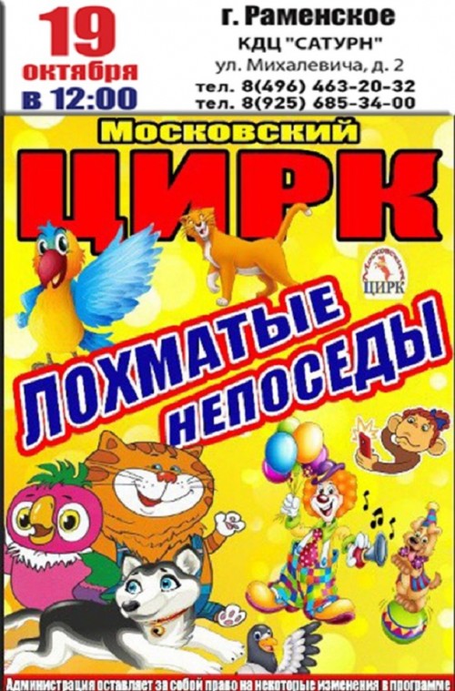 19 октября 2019 года Культурно-досуговый центр «Сатурн» представляет Спектакль Цирк «Лохматые непоседы»
