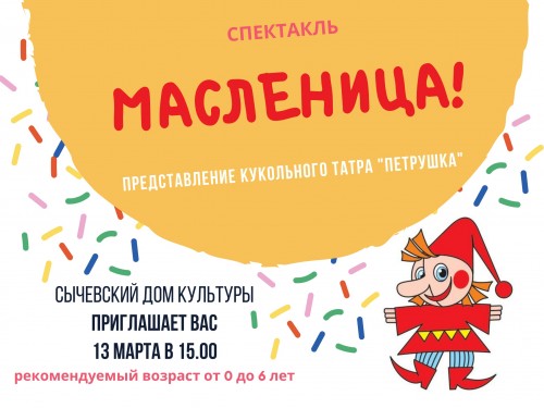 13 марта в 16.00 в холле Сычевского Дома культуры пройдет кукольный спектакль «Масленица» для самых маленьких зрителей.