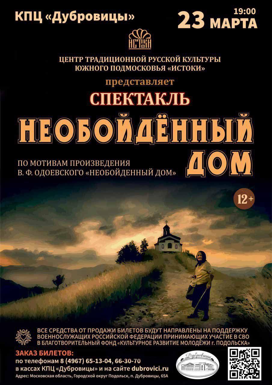 Спектакль по мотивам произведения В.Ф. Одоевского представит Центр традиционной русской культуры южного Подмосковья «Истоки». Это христианская притча о добродетелях и грехе, о пробуждении совести и воскрешении падшей души. Сюжет прост и одновременно сложен. Старушка спешит на утреню, решает пойти короткой тропкой через лес, но постоянно натыкается на один и тот же дом. Смысл бесконечных плутаний богомолки во времени и пространстве заключался в том, что нельзя прийти к истине и свету, если ты не приведешь за собой, не заставишь раскаяться хотя бы одного грешника. Но, как и в любой религиозной притче, есть и второй смысл у этого волшебного, какого-то манящего названия. Необойденный дом — это судьба, которая может долго, окольными путями водить тебя по кругу, но непременно в конце концов приведет в то место, которое и есть только твое. И когда человек приходит в это место, время и пространство подчиняются ему, меняются окружающие, раскрывая в себе нечто новое, и происходят чудеса. Все средства от продажи билетов будут направлены на поддержку военнослужащих Российской Федерации принимающих участие в СВО в Благотворительный фонд «Культурное развитие молодёжи г. Подольска».