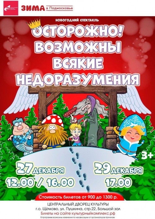 С 27 по 29 декабря 2023 года Щёлковский районный культурный комплекс представляет Спектакль Новогодний спектакль «Осторожно, возможны всякие недоразумения!»