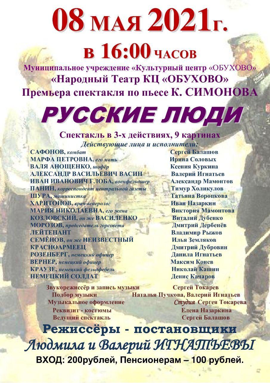С 5 по 8 мая 2021 года Культурный центр «Обухово» представляет Спектакль «Русские люди»