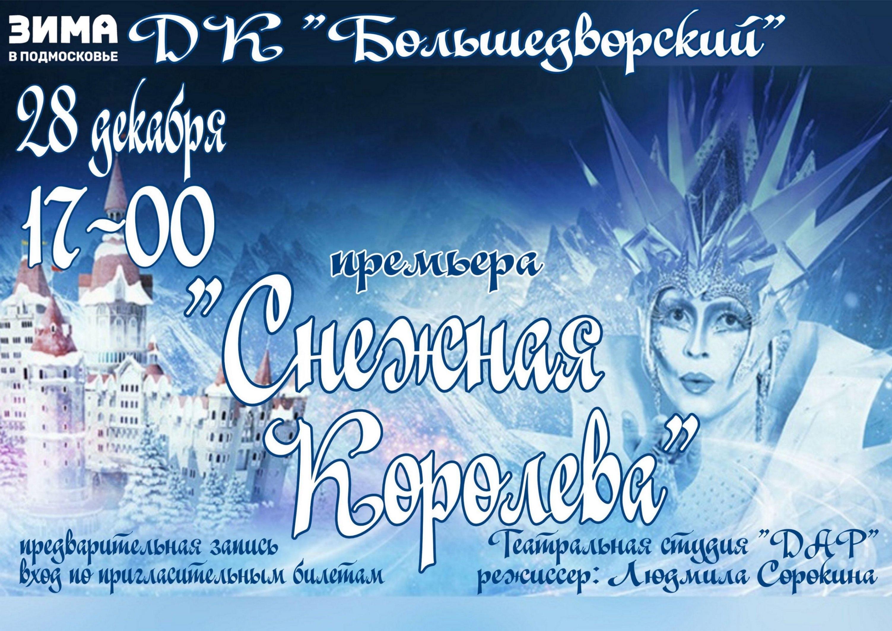 состоится премьеру новогоднего спектакля о сказочной злодейке Снежной королеве от театральной студии «Дар», руководитель Людмила Сорокина, по мотивам сказки Ганса Христиана Андерсена. Участники студии будут рады видеть ребят и их родителей на премьере спектакля.