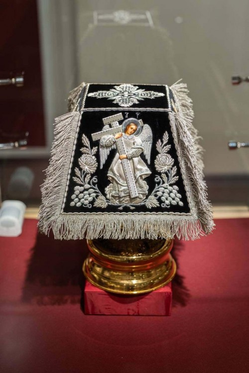 На выставке представлены тканые предметы богослужебного назначения, выполненные как в технике ручного шитья, так и с использованием электронной машинной вышивки.