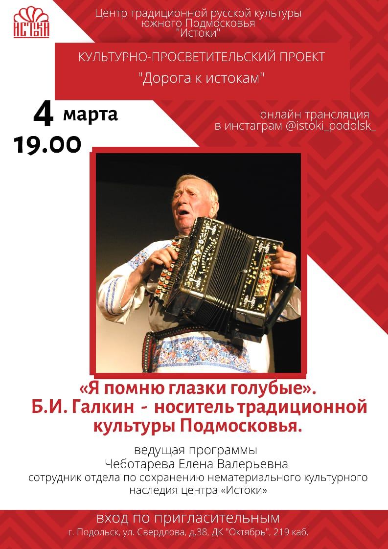МУК ЦТРКЮП «Истоки» в рамках культурно-просветительского проекта «Дорога к истокам» состоится творческий показ «Я помню глазки голубые.» Борис Иванович Галкин – носитель традиционной культуры Подмосковья». Сотрудник отдела по сохранению нематериального культурного наследия Е.В. Чеботарева — ведущая программы — расскажет о необыкновенно талантливом гармонисте и танцоре: Борисе Ивановиче Галкине, проработавшем в центре «Истоки» больше 20 лет. Воспитанники центра покажут, как одевались, танцевали, пели, играли на инструментах в родном Подмосковье. Вы сможете так же увидеть уникальные архивные записи разных лет, сделанных Центром «Истоки» в экспедициях в д. Акулово и Сальково Подольского района Московской области.Фотографии события